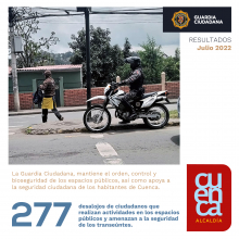 La Guardia Ciudadana emitió un informe del trabajo realizado por los Agentes de Control Municipal en los diferentes espacios públicos del cantón durante el mes de julio