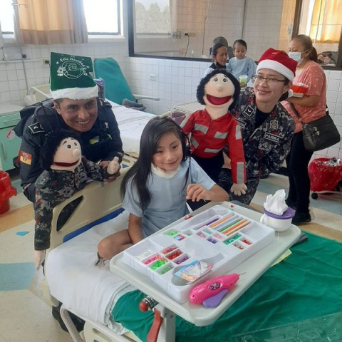 Ana y Alfonso, nuestros agentes lúdicos de la Guardia Ciudadana, llevaron alegría al área pediátrica del Hospital José Carrasco Arteaga.Con mensajes navideños y juegos lúdicos vivieron un ambiente festivo los pequeños.