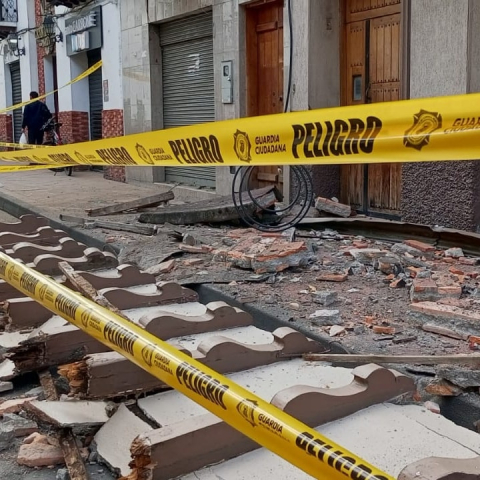 #GuardiaCiudadana coloca cinta de peligro en el lugar donde cayó parte del techo de una vivienda en el Centro Histórico de #Cuenca.Se coordinó con personal de Obras Públicas para la remoción de los escombros.El hecho se suscitó en la calle General Torres.