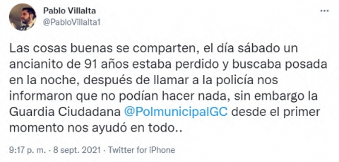 “Las cosas buenas se comparten, el día sábado un ancianito de 91 años estaba perdido y buscaba posada en la noche, después de llamar a la policía nos informaron que no podían hacer nada, sin embargo la Guardia Ciudadana @PolmunicipalGC desde el primer momento nos ayudó en todo..