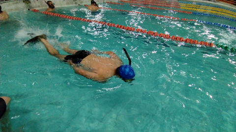 Los agentes de la Guardia Ciudadana inscritos para el curso de Rescate y Búsqueda en Lagos y Ríos que se desarrolla para posteriormente conformar la unidad respectiva, dan pruebas para ser seleccionados. Estas pruebas consisten en salto, apnea vertical y 100 metros de natación.